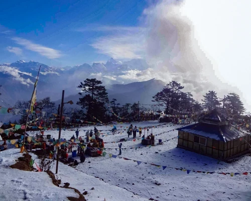 Venturing on a helicopter ride to the Pathivara Devi temple in eastern Nepal is among the most preferred approaches to exploring Hindu temples in the country. The Pathivara Helicopter Tour offers a seamless and suitable means to reach the sacred temple of Goddess Pathivara Devi. During the helicopter ride, passengers are treated to awe-inspiring sceneries of the mountains in eastern Nepal, encompassing the majestic Kanchenjunga, the world's third-highest peak in the Kumbhakarna Himalayan range. The Pathivara temple holds extraordinary reverence among the Kirat people, who present the goddess with offerings, including animal sacrifices, gold, and silver. Enhancing the charm of this journey are additional attractions such as the picturesque Sawa waterfall and the nearby Timbung Pokhari (pond).