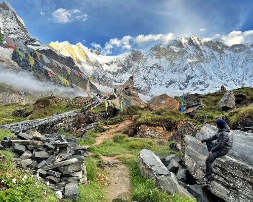 As you go higher, the air gets colder, and the trees start to disappear. Finally, you reach Annapurna Base Camp at 4,130 meters. From here, you can see some of the tallest mountains in the world, like Annapurna I and Machapuchare (Fishtail Mountain). These mountains look even bigger and more powerful when you're standing right in front of them. Watching the sunrise here is something you will always remember.